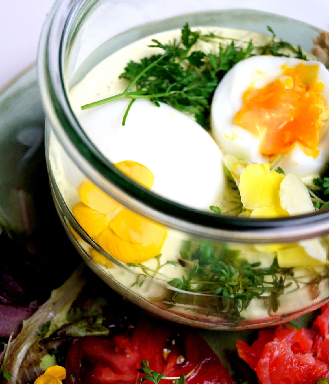 Die Glser mit Deckel und Bgel verschlieen. Eierkoch oder Glser mit Butter ausstreichen. Kruter Olivenl Senf Zitronensaft und Kefir fein prieren mit Salz und Pfeffer abschmecken.